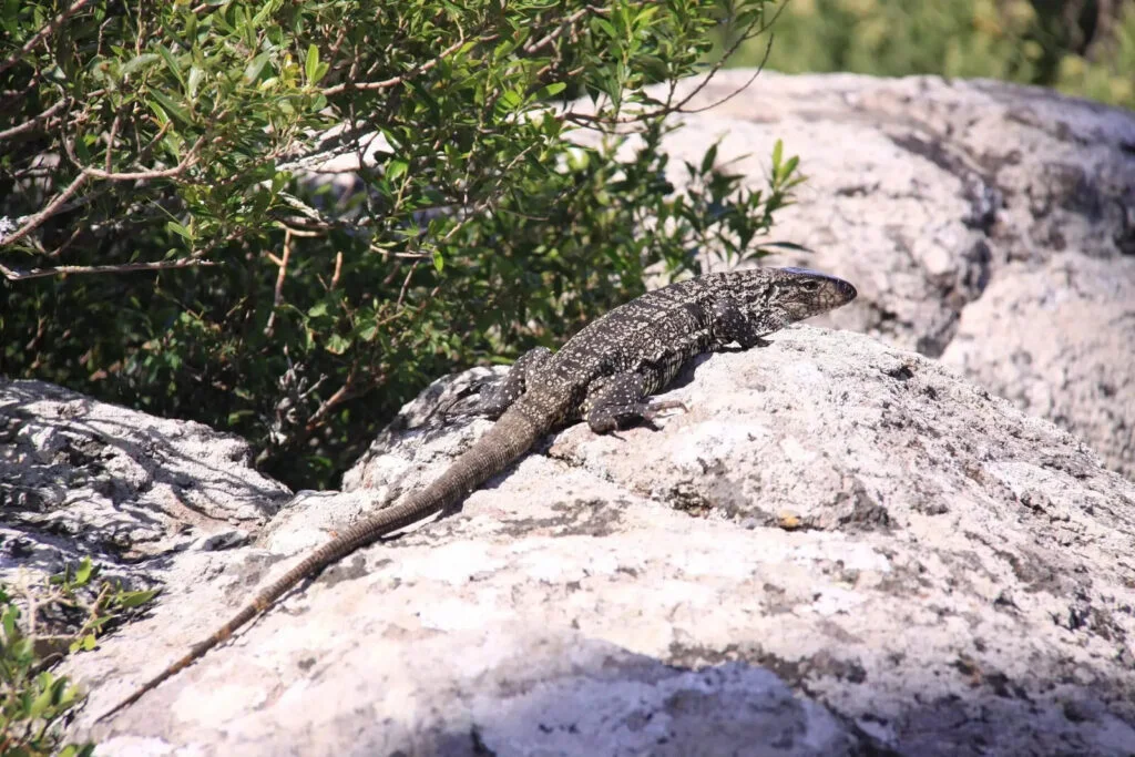 O teiú é um lagarto grandão, chega a medir mais de um metro de comprimento. Ele é onívoro, comendo desde frutas até pequenos animais. O teiú é importante porque ajuda a controlar a população de insetos e pequenos roedores, além de ser um dos predadores naturais de ovos de outras espécies, mantendo o equilíbrio ecológico.